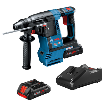 This Bosch 18V Bulldog™ hammer consistently outperforms the best-selling 1 In. corded 11255VSR Bulldog™, making it better than the best. The Bosch GBH18V-26K25 kit pairs two CORE18V 4.0 Ah Compact Batteries with an SDS-plus® Bulldog™ 1 In. Rotary Hammer that delivers 1.9 Ft.-Lbs. of impact energy (EPTA). The hammer’s brushless motor maximizes battery runtime for extended performance. It also has KickBack Control, an integrated sensor to stop tool rotation in bind-up situations; Electronic Precision Control, for smoother bit starts; and Vibration Control, for extended user comfort. It weighs only 7.4 Lbs. (with included battery). The kit features two CORE18V Compact Batteries, which deliver light weight and high power, and they are equipped with CoolPack technology for extended life. They are engineered with 21700 cell technology and advancements in design to reduce resistance and increase efficiency.
