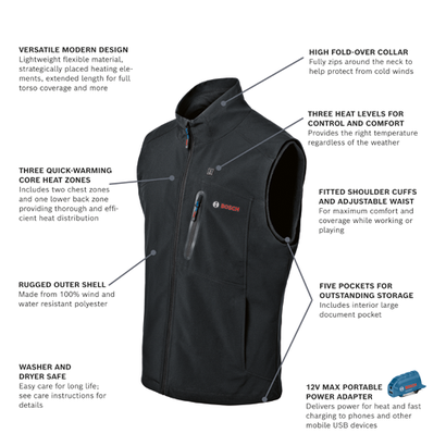 The Bosch GHV12V-20 Heated Vest Kit features a versatile modern design, light and flexible material, large pockets and strategically placed heating elements. The vest features three powered heating zones combined with rugged outer shell that's wind- and water-resistant for comfort and durability. The three heat zones include two chest zones and one lower back, strategically placed for thorough and efficient heating. The kit includes the GAA12V-21 12V Max Portable Power Adapter, which helps users employ a Bosch 12V Max battery to deliver 2.1 Amps. This adapter also powers up many common personal devices, such as mobile devices, phones, tablets and more. Users looking for even more runtime and ability to use their Bosch 18V batteries can opt for a compatible GAA18V-24 18V Portable Power Adapter, sold separately.