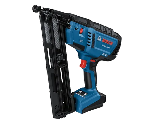 The Bosch GNH18V-15MA 18V Brushless 15-gauge Angled Finish Nailer delivers power and precision in a cordless solution. Compact and ergonomically designed, the 15-gauge angled finish nailer operates at a 34-degree angle giving workers the flexibility to access tight spaces, while also helping reduce worker fatigue. The efficient, brushless motor delivers the power to consistently sink 15-gauge angled finish nails ranging from 1-¼ In. to 2-½ In. which makes it ideal for fastening interior trims, crown moldings, baseboards, window and door casings, and other dense wood applications. The 15-gauge finish nailer features an angled magazine with a capacity of 105 nails. When paired with a CORE18V 4 Ah battery (sold separately), it can fasten up to 1,200 nails per charge, ensuring extended productivity. One-handed activation simplifies operation for quick and hassle-free nailing that is suitable for both right- and left-handed users. Equipped with a large viewing window and a no-mar contact tip, the 15-gauge angled finish nailer provides superior line of sight, helping minimize costly mistakes by giving workers improved sight of the workpiece while in use. The dry-fire lockout feature automatically stops operation when down to the last five nails. This not only prevents blank firing but also safeguards the workpiece from potential damage. Make easy and precise adjustments to the depth setting with the ergonomic thumb wheel. Additionally, downtime is minimized as jammed nails can be quickly cleared through a tool-free release mechanism while on the job. An intuitive user interface allows for easy toggling between single and bump-fire modes, turns the LED light on and off, and informs the worker of scheduled maintenance of the tool. An integrated heavy-duty belt hook provides easy portability and storage between tasks.