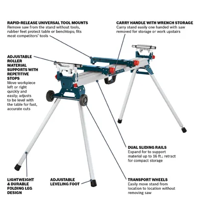 Bosch stand with features including Rapid-Release Universal Tool Mounts, Adjustable Roller Material Supports with Repetitive Stops, Carry Handle with Wrench Storage, Dual Sliding Rails, Lightweight & Durable Folding Leg Design, Adjustable Leveling Foot, and Transport Wheels.