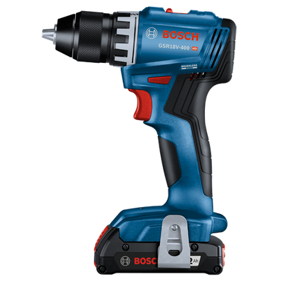 Bosch GSR18V-400 HD cordless drill, with 20 clutch settings, all-metal chuck, LED light, brushless motor, ergonomic grip zone, and up to 400 In.-Lbs. of max torque.