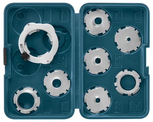 The Bosch RA1128 8 pc. Template Guide Set features six popular router template guides, including large and small dovetail router guides and two radius hinge guides. It also includes the Bosch RA1126 Quick-Change Template Guide Adapter plus the RA1100 Interface for Threaded Template Guides. The quick-change adapter accepts Bosch RA-series template guides. It also accepts the RA1100 interface piece, which allows the template guide adapter to accept Porter-Cable® and similar common threaded template guides (and reducer inserts) that that are sized for a 1-3/8” counter-bore. This template guide set works with many Bosch routers, including the 1613AEVS, 1617-, 1618-, 1619- and MR23-Series routers, as well as the plunge bases for Bosch palm routers.