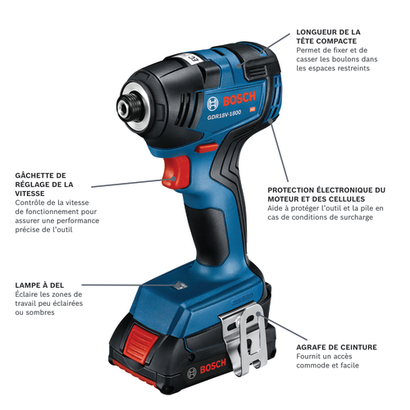 La visseuse à chocs hexagonale de 1/4 po GDR18V-1800 est idéale pour les applications de serrage et fixation professionnelles grâce à son design bien pensé et son couple de 1 800 po-lb. Elle bénéficie du design Compact Impactor Bosch avec une tête de seulement 4,9 po de long facilitant l’accès aux endroits exigus. L’outil ne pèse que 2,3 lb (outil seul, sans batterie). Il produit 4 000 impacts par minute et une vitesse de 3 400 tr/min. Il permet de réaliser une grande variété de serrages sur un chantier. La visseuse dispose d’une gâchette de variation de vitesse pour une meilleure maîtrise de l’outil ainsi que d’un éclairage DEL.