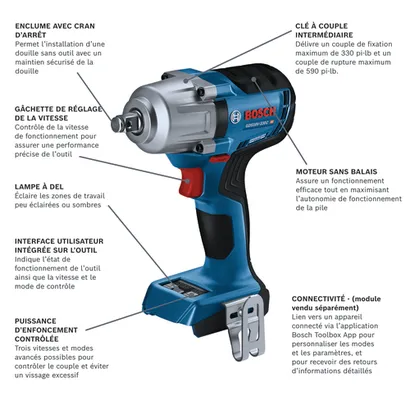La clé à chocs 18 V sans balais de 1/2 po à couple moyen Connected-Ready GDS18V-330C Bosch est remarquablement performante pour visser des tirefonds dans des poutres épaisses, assembler des structures métalliques ou retirer des écrous de roue récalcitrants. Cette clé à chocs est dotée d’un porte-outil 1/2 po avec bague de friction et trou traversant pour des changements de douille rapides et un maintien parfait. Le moteur sans balais permet de visser avec un couple de serrage jusqu’à 330 pi-lb et de dévisser avec un couple de décollement de 590 pi-lb tout en bénéficiant d’une grande autonomie. Les modes tels que Auto Stop (arrêt automatique) peuvent être configurés pour éviter tout serrage excessif risquant d’endommager les pièces et vis de fixation. Des réglages spécifiques peuvent être paramétrés et mémorisés pour des certains types de vis, boulons et matériaux via l’application Bosch PRO360 (requiert un module de connectivité vendu séparément). Quand le mode boulon est activé, la fonction ABR (Auto Bolt Release) arrête la rotation dès que le boulon ou l’écrou est desserré afin d’éviter qu’il tombe accidentellement. La fonction connectivité (requiert un module spécial vendu séparément) ne permet pas seulement de paramétrer et personnaliser des modes et des réglages, elle permet aussi d’obtenir des informations spécifiques sur l’outil et son état. Il s’agit d’un ensemble ne comprenant que l’outil ; la batterie et le chargeur sont vendus séparément.