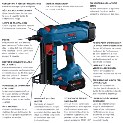 Le cloueur à béton 18V PROFACTOR™ GNB18V-12 Bosch 18V fait partie du système PROFACTOR™ permettant de disposer de la puissance nécessaire pour les travaux de clouage de charpentes en acier ou de plaquisterie. Le cloueur est capable d’enfoncer des clous à béton en bande jusqu’à 1,5 po dans du béton. Fait partie du système PROFACTOR™ associant la technologie BITURBO Brushless™ et une batterie High Power CORE18V®. La technologie BITURBO Brushless™ combine un moteur haute performance et un système de transmission conçu pour fournir une puissance comparable à celle des outils filaires à forte demande. Alimenté par une batterie CORE18V®, ce cloueur sans fil est un substitut idéal aux cloueurs béton alimentés par gaz car il fonctionne sans cartouches de gaz. Son système d’entraînement à ressort pneumatique permet de clouer rapidement avec toujours la même précision. Il est fourni avec un chargeur 22 clous en bande (un chargeur 44 clous est disponible séparément) et un embout pour clou unique. Ce cloueur de type ouvert permet d’utiliser aussi bien des clous en bande que des clous pour tir unique. Bosch propose en plus une grande gamme de clous de 5/8 po à 1-1/2 po pour le béton et de 1/2 po à 3/4 po pour l’acier. Il dispose d’un réglage de profondeur facile à utiliser et d’un écran de contrôle intégré servant à la gestion des performances de l’outil ainsi qu’à l’affichage de défauts et du niveau de charge de la batterie. La batterie High Power CORE18V® de 8 Ah est compatible avec les outils Bosch 18V et optimisée pour les outils PROFACTOR™. Elle offre une autonomie 2 fois plus élevée que la batterie Advanced Power CORE18V® GBA18V40.