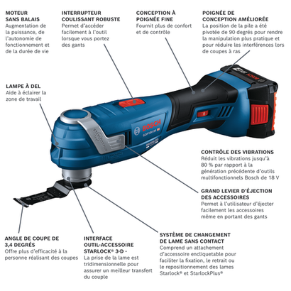 • Vibration Control : réduit les vibrations de 80 % par rapport à la génération précédente d’outils oscillants multifonctions 18V de Bosch.