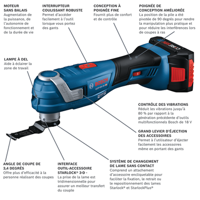 • Dispositif Vibration Control : réduit les vibrations de 80 % par rapport à la génération précédente d’outils oscillants multifonctions 18V Bosch.