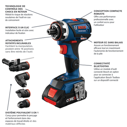 La perceuse/visseuse 18V Bosch s’adresse aux professionnels à la recherche d’une perceuse/visseuse connectée offrant un couple élevé pour pouvoir repousser les limites et venir à bout des travaux exigeants. Il s’agit d’un outil Connected-Ready à couple élevé repoussant les limites. La perceuse est équipée d’un porte-embout hexagonal de 1/4 po à desserrage rapide et du système FlexiClick® 5 en 1 incluant trois adaptateurs de qualité professionnelle : renvoi d’angle, porte-embout excentré et mandrin métallique sans clé de 1/2 po. La perceuse/visseuse 18V GSR18V-535FCB15 peut produire jusqu’à 535 po-lb de couple. Les utilisateurs peuvent également ajouter un adaptateur pour marteau perforateur (non inclus), qui transforme la perceuse en marteau perforateur SDS-plus®, pour percer dans la maçonnerie. L'outil est équipé d’un porte-embout hexagonal de 1/4 po à desserrage rapide et du système FlexiClick® 5 en 1 incluant trois adaptateurs de qualité professionnelle : un mandrin renvoi d’angle de 1/2 po, un mandrin excentré et un mandrin automatique métallique de 1/2 po. Le kit comprend une batterie Advanced Power CORE18V® 4 Ah avec cellules Lithium-Ion 21700 nouvelle génération et un chargeur 18V. La perceuse se distingue par sa connectivité (requiert un module de connectivité vendu séparément) établissant une liaison avec un appareil mobile via l’application Bosch PRO360 pour personnaliser les réglages et recevoir des informations détaillés sur l’état de l’outil. La perceuse est dotée du système KickBack Control, d’un embrayage de précision et d’un moteur sans balais performant.