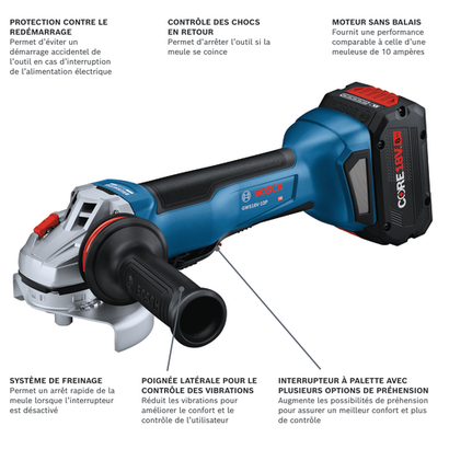 La rectifieuse angulaire 18V sans balais de 4-1/2 – 5 po GWS18V-10P Bosch est une rectifieuse solide et ergonomique avec poignée fine pour un meilleur confort d’utilisation et une puissance très élevée. Cette rectifieuse sans fil allie à la perfection performances, maîtrise et puissance. Le moteur sans balais de la rectifieuse permet de disposer d’une puissance comparable à celle d’une rectifieuse filaire de 10 A et de performances améliorées, pour une plus grande autonomie et productivité. La rectifieuse possède un système de freinage assurant une immobilisation très rapide du disque lorsque l’interrupteur Marche/Arrêt est placé sur Arrêt. Elle dispose aussi d’autres fonctions électroniques évoluées, notamment d’un contrôle des risques de rebond (KickBack Control), d’une protection anti-redémarrage et d’une constante électronique permettant de travailler à vitesse constante quelle que soit la charge. Elle est par ailleurs dotée d’un interrupteur à palette non blocable actionnable dans plusieurs positions pour un plus grand confort et une meilleure maîtrise et dispose, sur la tête d’engrenage, d’un collier de fixation compatible avec tous les capots de protection Bosch pour rectifieuses. L’ensemble comprend une batterie haute performance CORE18V® 8 Ah optimisée pour les outils PROFACTOR™ qui offre une autonomie 2 fois plus longue qu’une batterie GBA 18V40.