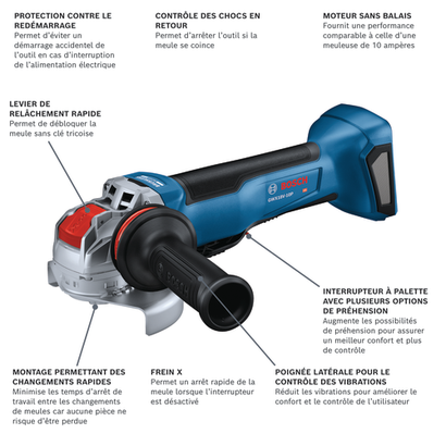 La rectifieuse angulaire 18V sans balais de 4-1/2 – 5 po GWX18V-10P Bosch est une rectifieuse solide et ergonomique avec poignée fine pour un meilleur confort d’utilisation et une puissance très élevée. Cette rectifieuse sans fil allie à la perfection performances, maîtrise et puissance. Elle dispose de l’interface X-LOCK innovante permettant de changer d’accessoire jusqu’à 5 fois plus rapidement qu’avec une interface de fixation conventionnelle. Un clic est audible lors du montage d’un accessoire X-LOCK (meule, disque, brosse) sur une rectifieuse X-LOCK. Le montage d’un accessoire ne nécessite ni clé à ergots ni écrou à embase. Pour retirer l’accessoire de la rectifieuse, il suffit d’actionner un levier. Le moteur sans balais de la rectifieuse permet de disposer d’une puissance comparable à celle d’une rectifieuse filaire de 10 A et de performances améliorées, pour une plus grande autonomie et productivité. La rectifieuse possède un frein X-Brake assurant une immobilisation très rapide du disque lorsque l’interrupteur Marche/Arrêt est mis sur Arrêt. Elle dispose aussi d’autres fonctions électroniques évoluées, notamment d’un contrôle des risques de rebond (KickBack Control), d’une protection anti-redémarrage et d’une constante électronique permettant de travailler à vitesse constante quelle que soit la charge. La rectifieuse est dotée d’un interrupteur à palette actionnable dans diverses positions pour plus de confort et une meilleure maîtrise. L’interrupteur n’est pas blocable en position de marche, ce qui fait que le moteur s’arrête dès qu’il est relâché. La rectifieuse dispose sur la tête d’engrenage d’un collier de fixation amélioré, désormais compatible avec tous les capots de protection pour métal et béton Bosch.