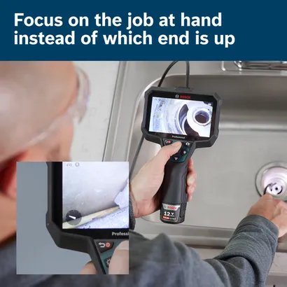Bosch 12 V 2.0 Ah Li-Ion Professional inspection camera, displaying a metal sink drain and an inset of another view, with "Focus on the job at hand instead of which end is up" text.