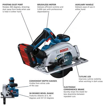 Bosch circular saw with pivoting dust port, brushless motor, auxiliary handle, cutline LED, convenient depth gauges, 50 degree bevel range, and electronic convenience brake.