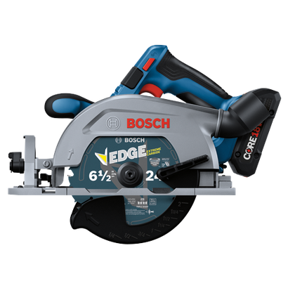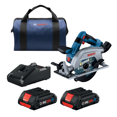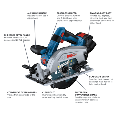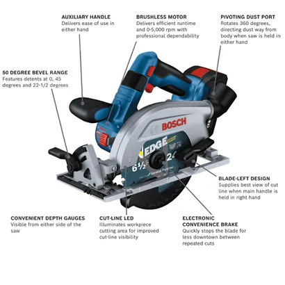 This circular saw has a 2-1/4 In. cut capacity, cutting through 2X (“two by”) material across the entire bevel range. The Bosch GKS18V-22L 18V Blade-Left 6-1/2 In. Circular Saw has a brushless motor, which delivers efficient runtime and 5,000 rpm with professional dependability. This compact saw weighs only 6.1 Lbs. (tool only, not including battery). The saw’s blade left design provides a cleaner view of the blade for better cut-line visibility when held in the right hand. When held in the left hand it provides great balance and control for cross cuts. The auxiliary handle improves stability and ergonomic handling in either hand. The saw's convenient depth gauges are visible from either side of the saw and it has a 0-50 degree bevel range, with detents at 0, 45 and 22-1/2 degrees. It features two convenient depth gauges, one on the lower guard and one by the housing so depth is visible on either side of the saw. It has an electronic convenience brake for less downtime between cuts. The 360 degree pivoting dust port directs dust away from the body when the saw is held in either hand. This saw also features a cut-line LED to illuminate workpiece cutting area for improved cut-line visibility. It includes an on-board blade-change wrench and spindle lock for easy blade changes. The kit features two CORE18V® 4 Ah Advanced Power Batteries, which each delivers 2x the runtime compared to previous generation BAT612 2 Ah battery.