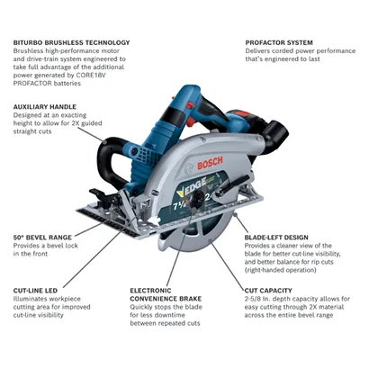 Bosch circular saw, with 7 1/4" blade, 2-5/8 in. depth capacity, 50° bevel range, and Blade-Left Design.