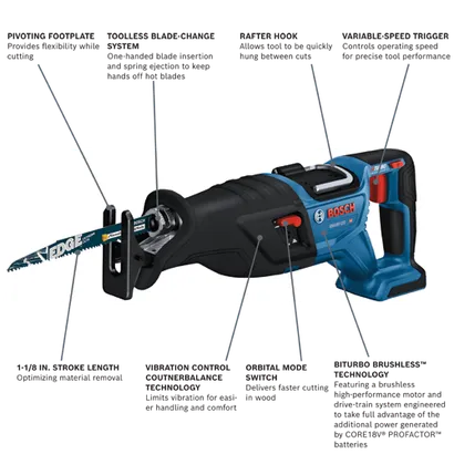 The Bosch GSA18V-110N Reciprocating Saw features a long 1-1/8 In. stroke, optimizing for more material removal in various materials, and LockJaw toolless blade-change system for quick one-handed blade insertion and spring ejection. It provides 0-2,900 spm for fast cutting, and efficient cutting in metal, wood and more while allowing close-to-the-wall cuts. This saw is part of the PROFACTOR™ System, which pairs BITURBO Brushless™ Technology with a CORE18V® High Power Battery. BITURBO Brushless™ Technology is a high-performance motor and drive-train system designed to deliver power comparable to high-demand corded tools. It offers performance comparable to Bosch 11A corded reciprocating saws. The saw has a variable-speed trigger for controllable power and speed and an orbital-mode switch for faster cutting in wood. It features an ergonomic design and vibration control for user comfort while working. The GSA18V-110 has on-tool storage for footplate depth adjustments and a pivoting footplate for flexibility while cutting. It has a rafter hook for quick hang-up on the job.