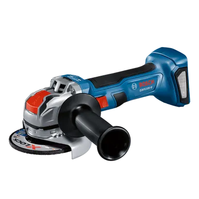 The Bosch GWX18V-8 is an ergonomic X-LOCK angle grinder that combines portability, performance and best user comfort. Its brushless motor provides equivalent 8.0 amps of power and greater efficiency that maximizes runtime and productivity. It features the X-LOCK mount, offering a wheel change interface that's up to five times faster than conventional interfaces. There’s an audible snap when mounting an X-LOCK wheel on an X-LOCK grinder. The wheel mounts properly without the need for a spanner wrench or flange nuts. The wheel is released from the grinder with the pull of a lever. This 4-1/2 In. 18V grinder has restart protection to help prevent accidental start-up when switching batteries, soft-start technology to reduce startup torque and ease into cuts, and overload protection to reduce the risk of the motor overloading or overheating It is designed with spiral bevel gears that provide smooth transmission of power to grinding applications. It also features an adjustable tool-free guard and an updated gearhead mounting collar, which is now compatible with all Bosch metal and concrete cutting guards. This tool features a two-position side handle and a slim soft-grip design.