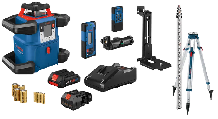 El kit de láser giratorio conectado y autonivelador horizontal/vertical de 18 V REVOLVE4000 con calibración realizada por el usuario uCAL constituye una solución integral para aplicaciones de nivelación en exteriores e interiores. Tiene una función Dual Dial-In Slope (doble cuadrante de inclinación) que permite el ajuste del ángulo de la pendiente en los ejes X e Y, para aplicaciones de nivelación. Este láser funciona con una batería Bosch CORE18V® de 4 Ah que proporciona un tiempo de ejecución prolongado. El láser giratorio es compatible con baterías de iones de litio CORE18V® de Bosch de 4 Ah y 8 Ah. También cuenta con un adaptador alcalino para usar cuatro celdas (D). El REVOLVE4000 está diseñado con una cubierta de protección y un diseño innovador de manija, y está construido según los estándares de protección contra el polvo y el agua IP68. Cuenta con conectividad Bluetooth® para vincularse a un dispositivo conectado a la aplicación Leveling Remote de Bosch. Esta aplicación controla el encendido/apagado, la función Dual Dial-In Slope (doble cuadrante de inclinación) y más. El láser giratorio cuenta con uCAL, para que el usuario realice la calibración con ayuda de una guía paso a paso del proceso. Esto evita el tiempo de inactividad de la herramienta y proporciona la confianza de que el láser es preciso. Aporta una precisión de hasta ±1/16" a 100 ft en aplicaciones horizontales y de ±1/8" a 100 ft en modo vertical, y un alcance de hasta 4.000 ft con un receptor láser. El láser cuenta con un haz vertical a un punto de 90º para aplicaciones de disposición, encuadre y plomada. El kit completo incluye control remoto, batería de 18 V y 4 Ah con cargador, adaptador de baterías alcalinas, montaje para pared, receptor láser, tripié de aluminio, varilla resistente y estuche duradero y resistente.