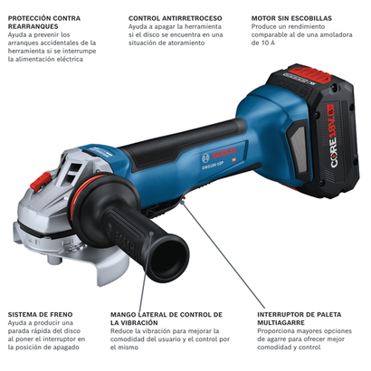La amoladora en ángulo sin escobillas de 18 V y 4-1/2– 5" GWS18V-10P de Bosch es una amoladora ergonómica y robusta que está diseñada con una zona de agarre angosta para una mayor comodidad del usuario y una potencia considerable. Ofrece la combinación más innovadora de desempeño, control y potencia en una amoladora inalámbrica. El motor Brushless sin escobillas de la amoladora ofrece un desempeño comparable al de una amoladora con cable de 10 A y una mayor eficacia que maximiza el tiempo de ejecución y la productividad. La amoladora cuenta con un sistema de frenado que ayuda a realizar una parada rápida cuando se apaga el interruptor. También incluye otros componentes electrónicos avanzados, como KickBack Control, la protección contra el reinicio y la electrónica constante para una velocidad uniforme bajo carga. La amoladora cuenta con un interruptor de palanca antibloqueo con múltiples posiciones de agarre que ofrece una mayor variedad de opciones de agarre para mejorar la comodidad y el control, y un collarín de montaje de cabezal que es compatible con todos los protectores de amoladoras de Bosch. El kit incluye la batería CORE18V® de alto desempeño de 8 Ah, que está optimizada para las herramientas PROFACTOR™ y ofrece el doble de tiempo de ejecución que la GBA18V40.