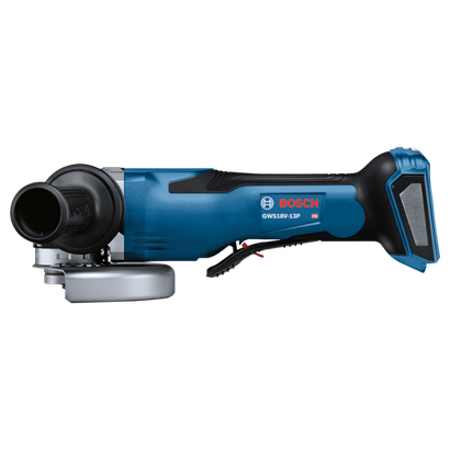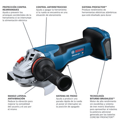 La amoladora angular GWS18V-13PN de 18 V y 5-6" de Bosch con interruptor de palanca antibloqueo ofrece la combinación más innovadora de desempeño, control y potencia en una amoladora inalámbrica. Esta herramienta forma parte del sistema PROFACTOR™, que combina la tecnología BITURBO Brushless™ con una batería High Power CORE18V®. La tecnología BITURBO Brushless™ consiste en un motor de alto desempeño y un sistema de transmisión diseñado para generar una potencia comparable a las herramientas con cable más exigentes. La amoladora incluye KickBack Control, que ayuda a apagar la herramienta si el disco se atasca. También cuenta con protección contra reinicio, que evita que la herramienta se encienda por accidente tras una interrupción del suministro eléctrico. También incluye otros componentes electrónicos avanzados, como electrónica constante y protección contra sobrecarga. La amoladora incluye un sistema de frenos, que ayuda a proporcionar una parada rápida del disco cuando se apaga la herramienta, y un interruptor de palanca de agarre múltiple, que proporciona mayores opciones de sujeción para mayor comodidad y control. Tiene engranajes biselados y en espiral que ofrecen una transmisión de potencia suave, así como un mango lateral Vibration Control con dos posiciones, protector ajustable sin herramientas y un agarre suave para una mayor ergonomía de sujeción.