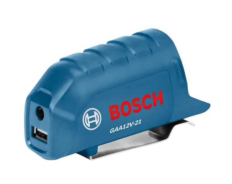 The Bosch GAA12V-21N 12V Max Portable Power Adapter helps users employ a Bosch 12V Max battery to deliver 2.1 Amps, to power up many common personal devices, such as mobile phones, mobile devices, and tablets. This adapter is the ideal carry-along item for anyone who is on the go all day and finds themselves running short of battery power for personal electronics. The output on this power adapter is 2.1 Amps, which makes it a powerful charger. It is a compact and light 12V Max device, but it is designed to withstand jobsite conditions and keep charging. The adapter has a port compatible with Bosch heated jackets, so users can power their jackets with 12V Max batteries. It includes a metal belt clip for additional user convenience. The power adapter has an on/off button to activate the power adapter for each charging session, and to begin powering the heated jacket.