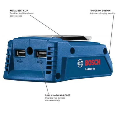 The Bosch GAA18V-48 18V USB Portable Power Adapter helps users quickly power up their other important tools – phones, tablets, and more – anywhere on the jobsite using an 18V Bosch Lithium-ion battery. The GAA18V-48 USB power adapter works with Bosch 18V Li-ion batteries delivering power to any 5V USB or 12V DC device(s), and is capable of charging two devices simultaneously. It is designed to withstand jobsite conditions and keep working. The output on this charger is 4.8 Amps, enough power to get mobile devices ready in a hurry. When simultaneously charging two devices, each output is 2.4 Amps Plus, the Bosch Portable Power adapter includes a port compatible with Bosch heated workwear, enabling users to stay warm during long cold days. The charger adapts to the device being charged, allowing for optimal charging current. while preventing overcharging by entering sleep mode once charging is complete. A metal belt clip is also included for additional storage and transportation convenience.