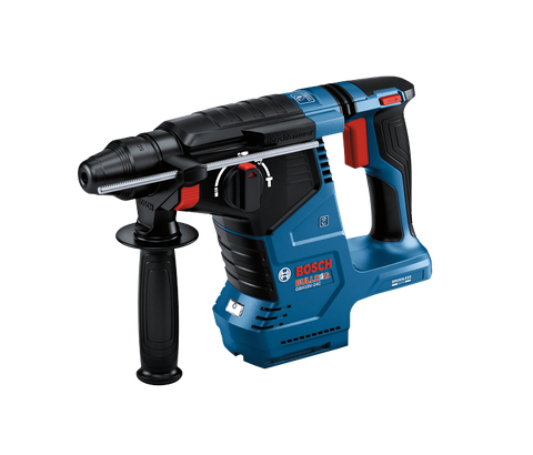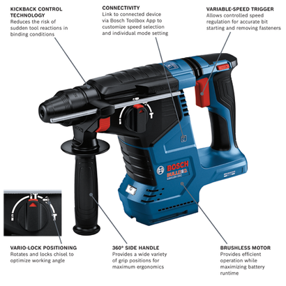 This Bosch Bulldog™ hammer provides superior performance and an outstanding impact-to-weight ratio. The GBH18V- 24CN 18V Brushless 1 In. SDS-plus® Bulldog™ Rotary Hammer delivers 1.8 Ft.-Lbs. of impact energy (EPTA). It weighs only 6.4 Lbs. (tool only, not including battery). The hammer’s brushless motor maximizes battery runtime for extended performance. It has KickBack Control, which reduces the risk of sudden tool reactions in binding conditions, and an anti-vibration system for great user comfort for extended periods of work. Its ergonomic L-shaped design provides better control when drilling overhead or in tight spaces. The 360-degree side handle provides a variety of grip positions for maximum ergonomics. The hammer has Vario-Lock positioning to optimize the working angle when the tool is used in hammer-only mode. The hammer’s robust power system produces 0-4,350 no-load bpm and 0-980 no-load rpm. It has three modes of operation: rotary hammer, rotation only and hammer only. This hammer features integrated connectivity, providing a link to the free Bosch Toolbox app on a connected device to customize settings.