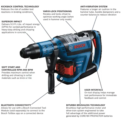 This 18V SDS-max® 1-7/8 In. rotary hammer delivers corded-type performance for heavy-duty concrete drilling and chiseling jobs. The Bosch GBH18V-45C Rotary Hammer delivers 9.3 Ft.-Lbs. of impact energy (EPTA). That is unprecedented for a single-battery 18V SDS-max® 1-7/8 In. rotary hammer. It weighs 20.4 Lbs. (with included battery). This hammer is part of the PROFACTOR™ System, which pairs BITURBO Brushless™ Technology with a CORE18V® High Power Battery. BITURBO Brushless™ Technology is a high-performance motor and drive-train system designed to deliver power comparable to high-demand corded tools. It has KickBack Control, rotary hammer and hammer-only modes, and Vario-Lock to rotate and lock the chisel. The anti-vibration system features a longer air cushion in the hammer tube and dampeners in the handle. It also has Soft Start and controlled rpm and bpm, making it easier to control drilling and chiseling applications. The hammer features an on-tool user interface for tool performance, feedback, and control. It has connectivity (module sold separately) to link to connected device via Bosch PRO360 App to customize settings and receive detailed feedback. The kit includes two CORE18V® 12 Ah High Power Batteries, which deliver equal power and at least 50% more runtime than the CORE18V® 8 Ah battery, powering high-demand applications. At only 3.04 Lbs., this 12 Ah battery provides performance comparable to larger and heavier alternatives. The kit has a battery turbo charger, providing 16-amp charging current for fast and faster charging, with an optional Power Boost™ mode.
