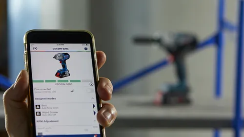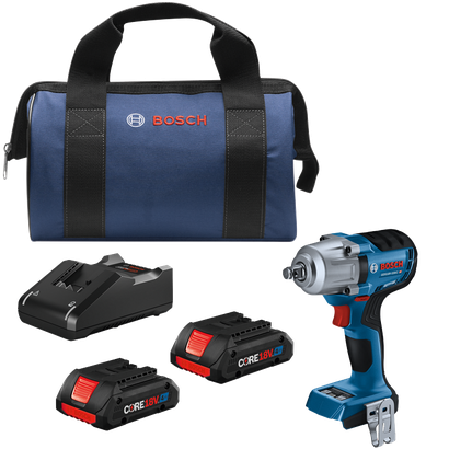 The Bosch GDS18V-330C 18V Brushless 1/2 In. Mid-Torque Impact Wrench delivers outstanding performance, whether driving lag bolts through heavy lumber, assembling metal structure, or removing stubborn lug nuts. This impact wrench has a 1/2 In. drive with a friction ring and thru-hole for quick socket changes and secure attachment. The brushless motor delivers up to 330 Ft.-Lbs. fastening torque and 590 Ft.-Lbs. breakaway torque while providing long runtime. Modes such as Auto Stop help prevent over driving, which can damage materials and fasteners. Presets for specific bolts, screws and materials can be customized and saved to the tool via the Bosch PRO360 App (connectivity module sold separately). When reversing in bolt mode, Auto Bolt Release senses when the bolt is loosened and stops rotation to help prevent accidental dropping of bolts and nuts during removal. In addition to customizable settings and modes, connectivity (module sold separately), provides tool specific information and feedback. The kit features two CORE18V® 4 Ah Advanced Power Batteries, which deliver 2x the runtime compared to previous generation BAT612 2.0 Ah battery.