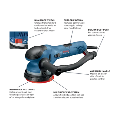 - Dual-mode design – easily switches between both standard random-orbit mode and turbo direct-drive eccentric-orbit mode