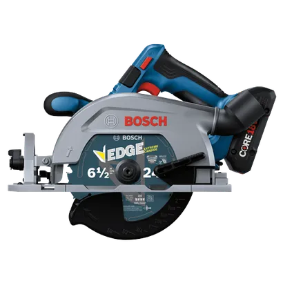 This circular saw has a 2-1/4 In. cut capacity, cutting through 2X (“two by”) material across the entire bevel range. The Bosch GKS18V-22L 18V Blade-Left 6-1/2 In. Circular Saw has a brushless motor, which delivers efficient runtime and 5,000 rpm with professional dependability. This compact saw weighs only 6.1 Lbs. (tool only, not including battery). The saw’s blade left design provides a cleaner view of the blade for better cut-line visibility when held in the right hand. When held in the left hand it provides great balance and control for cross cuts. The auxiliary handle improves stability and ergonomic handling in either hand. The saw's convenient depth gauges are visible from either side of the saw and it has a 0-50 degree bevel range, with detents at 0, 45 and 22-1/2 degrees. It features two convenient depth gauges, one on the lower guard and one by the housing so depth is visible on either side of the saw. It has an electronic convenience brake for less downtime between cuts. The 360 degree pivoting dust port directs dust away from the body when the saw is held in either hand. This saw also features a cut-line LED to illuminate workpiece cutting area for improved cut-line visibility. It includes an on-board blade-change wrench and spindle lock for easy blade changes. The kit features two CORE18V® 4 Ah Advanced Power Batteries, which each delivers 2x the runtime compared to previous generation BAT612 2 Ah battery.