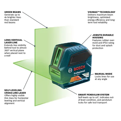 The Bosch GLL 100 G Green-Beam Self-Leveling Cross-Line Laser uses green-beam technology, which generates lines up to 4X brighter than standard red beams. This gives the laser a working range up to 100 Ft. The GLL 100 G produces vertical, horizontal and cross-line modes, and the tool can project two lines independently or together, for a broad array of alignment and leveling applications. It includes Bosch-exclusive VisiMax™ technology, which allows for outstanding line visibility in standard working conditions. It constantly monitors the laser's temperature so the diodes are always driven to maximum line visibility, while protecting the laser diodes from overheating. The tool has a working range up to 100 Ft., and it offers an accuracy of ±1/8 In. at 33 Ft. and ±3/8 In. at 100 Ft. The Bosch Smart Pendulum System self-levels and indicates out-of-level condition, to help ensure an accurate layout. It locks the pendulum after the laser is switched off for secure transport. The laser is built with sturdy over-molded construction with an IP54 rating to protect against dust and water. The included BM3 Positioning Device offers quick setup in ceiling grid applications and free-standing mode with its retractable feet and microfine height adjustment.