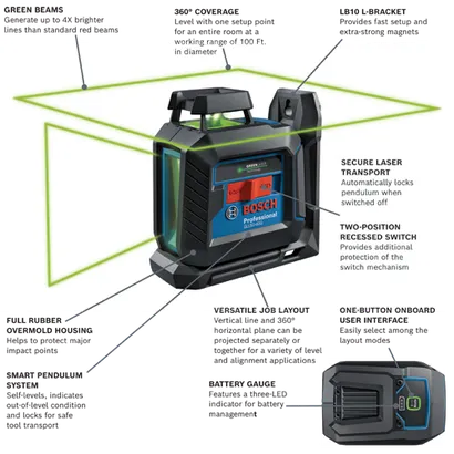 The Bosch GLL50-40G Green-Beam Self-Leveling 360° Cross-Line Laser uses green-beam technology, which emits green lines up to 4X brighter than standard red beams. This gives the laser a working range of up to 100 Ft. in diameter. The laser produces vertical line, 360° horizontal plane and cross-line modes, for a broad array of alignment and leveling applications. It provides 360° coverage to level with one setup point for an entire room. The tool has full rubber overmold housing, designed to be similar to a roll cage, so major impact points are reinforced with rubber. It has an IP64 rating and features deeply recessed windows help protect the laser glass. The one-button onboard user interface allows easy selection among the layout modes. The two-position recessed switch provides additional protection of the switch mechanism. The Bosch Smart Pendulum System self-levels and indicates out-of-level condition, and it locks the pendulum for secure transport. The included LB10 L-Bracket and DK10 ceiling clip offer quick setup and extra-strong magnets.