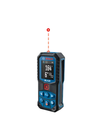 This 165 Ft. laser measure is a fully featured tool with an easy-to-read color display, great accuracy and reinforced housing for durability. The Bosch BLAZE™ GLM165-22 has accuracy up to ±1/16 In., plus it includes a rounding button that rounds the measurement to the fraction that best suits the application and haptic feedback for loud jobsites. The digital laser measure also offers full rubber overmold housing, designed to be similar to a roll cage. It is IP65 rated and has an ergonomic design for better grip. It has default real-time measurement mode, which immediately provides accurate measuring that automatically adjusts closer to or farther from the target. It includes 11 different measuring functions, including real-time length, length, area, volume and indirect functions, and addition/subtraction capability.