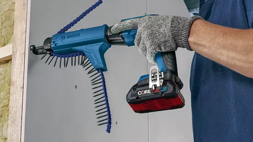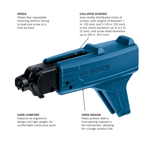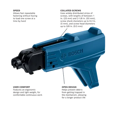 This auto-feed attachment is designed for the Bosch GTB18V-45 drywall screwgun. The GMA22 enables precise driving of rows of screws at top speed, while allowing comfortable continuous work, for added efficiency. It allows fast repeatable fastening without having to load one screw at a time by hand. It has an ergonomic design and is extremely light in weight. The drywall screwdriver attachment has an open design to help prevent debris from getting trapped in the mechanism, allowing for a longer product life. The GMA22 uses widely distributed strips of screws. These screws have lengths of between 1 In. (25 mm) and 2-1/8 In. (55 mm), screw shank diameters up to 0.2 In. (5 mm), and screw head diameters up to 3/8 In. (9.5 mm). the Bosch GTB18V-45 is an ergonomic screwgun, getting drywall jobs done comfortably and fast. It has a well-balanced grip, allowing the thumb and the index finger to control the operation, and Xtend Drive to activate the motor only when the bit senses pressure.