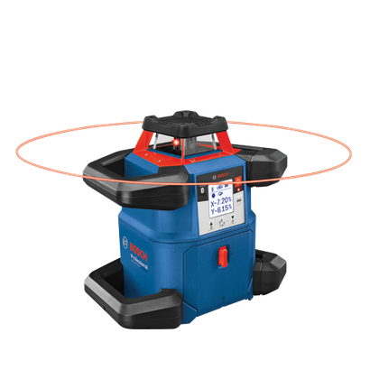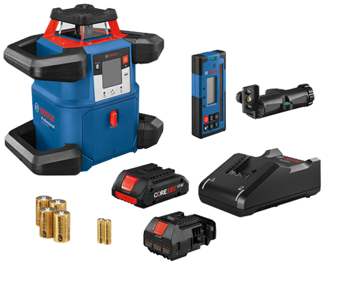 The Bosch 18V REVOLVE4000 Connected Self-Leveling Horizontal Rotary Laser with uCAL user-calibration delivers a comprehensive solution for precise outdoor and indoor leveling. It has a Dual Dial-In Slope feature that allows slope angle adjustment on both the X and Y axes, for grading applications. This laser is powered by a Bosch CORE18V® 4 Ah battery, providing extended runtime. The rotary laser is compatible with 4 Ah and 8 Ah Bosch CORE18V® Li-ion batteries. It also features an alkaline adapter to use four (D) cells. The REVOLVE4000 is engineered with a cage overmold and an innovative handle design, and it is built to IP68 dust- and water-protection standards. It features Bluetooth® connectivity to a connected device, linking to the Bosch Leveling Remote App. This app controls on/off, Dual Dial-In Slope, and more. The rotary laser features uCAL, for user-calibration, taking the user step by step through the calibration process. This avoids tool down time and provides confidence that the laser is accurate. It delivers accuracy of ±1/16 In. at 100 Ft., and a range of up to 4,000 Ft. with laser receiver.