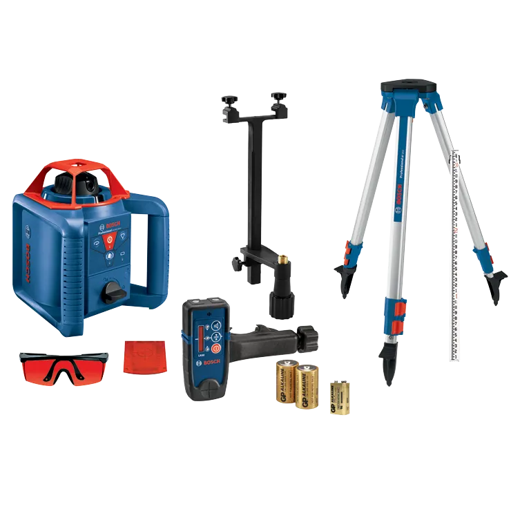 - Rotary laser kit – features a horizontal/vertical rotary laser with working range of up to 800 Ft. and includes a laser receiver, tripod, grade rod, wall mount, laser glasses, target card and a hard carrying case