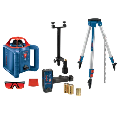 The Bosch GRL800-20HVK Self-Leveling Rotary Laser Kit delivers all-in-one package for precise outdoor and indoor leveling. It features a horizontal/vertical self-leveling laser, suitable for leveling, aligning and squaring applications. The rotary laser provides users with variable speed selection and manual scan angles for maximum visibility at different lighting conditions. It delivers accuracy of up to ±3/16 In. at 100 Ft, and a range of up to 800 Ft. with laser receiver. The electronic self-leveling system has a disturbance monitor, which indicates to the user if tool position changes, ensuring consistent leveling accuracy on the jobsite. Easy to use, the laser has a metal cage and an IP54 rating. This leveling solution includes a laser receiver, tripod, sturdy grade rod, wall mount, laser glasses, target card and hard carrying case.