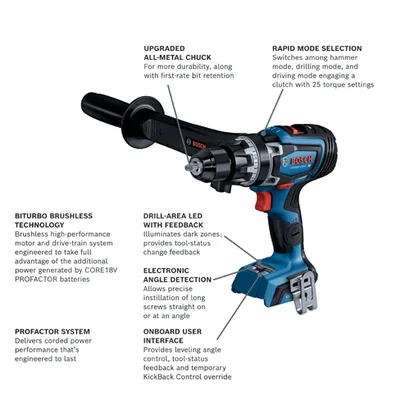 This Bosch 18V PROFACTOR™ hammer drill/driver is built for tough drilling and driving jobs, especially drilling large holes straight. The 1/2 In. GSB18V-1330C Hammer Drill/Driver is part of the PROFACTOR™ System, which pairs BITURBO Brushless™ Technology with a CORE18V® High Power Battery. BITURBO Brushless™ Technology is a high-performance motor and drive-train system designed to deliver power comparable to high-demand corded tools. This GSB18V-1330C 18V Connected-Ready 1/2 In. Hammer Drill/Driver features connectivity (module sold separately), linking to connected device via Bosch PRO360 App to customize settings, set custom angles, receive feedback and set specific angles for the Electronic Angle Detection feature. It has a powerful brushless motor that provides efficient power for up to 1,330 In.-Lbs. of max torque. It has variable speed settings: high speed (0-2,200 rpm) and high power (0-550 rpm). The hammer drill/driver has KickBack Control, which helps reduce the risk of injury from sudden rotational torque reaction in a bind-up scenario and Electronic Angle Detection to ensure accurate drilling at angle. The 25 clutch settings help reduce fastener damage. It has an all-metal chuck that provides durability, and it has a longer belt clip for a more secure hold.