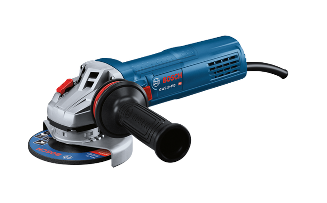 This 4-1/2 In. ergonomic angle grinder features a narrow grip zone for all-day comfort and control, combined with a powerful 10-amp motor. The Bosch GWS10-450 angle grinder delivers results, producing up to 11,000 no-load rpm for maximum productivity in grinding and cutting applications. The tool weighs 4.5 Lbs. Equipped with epoxy-coated field windings, double-sealed bearings and direct-motor cooling, this grinder is built for a longer tool life. It features spiral bevel gears for smooth transmission of power. For added convenience, it has an anti-vibration side handle, a lock-on slide switch and an adjustable tool-free guard with multiple fixed-adjustment settings to allow the user to position the guard in a variety of working angles. It has an updated gearhead mounting collar, which is now compatible with all Bosch metal and concrete guards.
