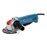 The Bosch GWX10-45PE 4-1/2 In. X-LOCK angle grinder features the X-LOCK mount, offering a wheel change interface that's up to five times faster than conventional interfaces. There’s an audible snap when mounting an X-LOCK Wheel on an X-LOCK grinder. The wheel mounts properly without the need for a spanner wrench or flange nuts. The wheel is released from the grinder with the pull of a lever. The grinder features a narrow grip zone. The GWX10-45PE ergonomic grinder features a narrow grip zone for extended comfort and control, combined with a powerful 10-amp motor. It delivers results, producing up to 11,000 no-load rpm for maximum productivity in grinding and cutting applications. The tool weighs 4.6 Lbs. It features a multi-grip lock-on paddle switch, which provides increased grip options for better ergonomics, comfort and control. Equipped with epoxy-coated field windings and direct-motor cooling, this grinder is built for a longer tool life. It features spiral bevel gears for smooth transmission of power. For added convenience, it has an auxiliary handle and an adjustable tool-free guard.