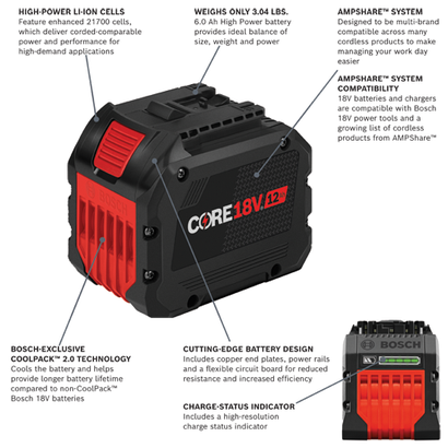 - Bosch-Exclusive CoolPack™ 2.0 technology – cools the battery and helps provide longer battery lifetime compared to non-CoolPack™ Bosch 18V batteries