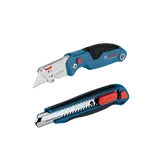 The Bosch H11-14100-1 2-Piece Utility Knife Set includes both a folding utility knife and 18mm snap-off utility knife for versatile cutting on the job. Both offer outstanding ergonomics and cutting performance with a robust, durable design and fast and easy blade changes. The snap-off utility knife includes an integrated end cap blade snap to easily access a fresh cutting edge without the need for another tool. Compact and portable, the folding knife is ideal for everyday carry and features a one-button folding lock, innovative built-in thumb rest to apply more force when cutting tougher materials, integrated handle blade storage, string/box strap cutter and belt clip for added convenience. Set includes (1) 18mm Snap-Off Utility Knife with preloaded standard snap-off blade and (1) Folding Utility Knife with (3) standard utility blades.