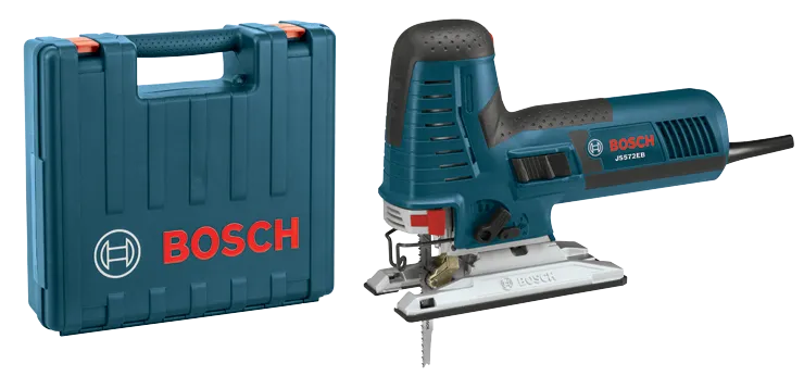 The Bosch JS572EBK Barrel-Grip Jig Saw Kit provides a tool with an upgraded upfront soft-grip area; it has the smallest circumference in its class. Thanks to the innovative Precision Control™ II double-roller system, it has outstanding cut accuracy, which minimizes blade deflection. Woodworkers and kitchen and bath installers are among the many user groups will appreciate the best-in-class 7.2 Amp motor and variable-speed control. Built with an aluminum gearbox with an insulated cover, this jig saw comes with a counterbalancing mechanism for low vibration and Constant Response circuitry for consistent speed under load. It has a large die-cast aluminum footplate with tool-free adjustment for fast and easy bevel adjustments. It also has LED lighting and a dust blower for max cut-line visibility and a toolless blade-change system. The multidirectional blade clamp provides superior grip of T-shank blades. (Bosch jig saws do not accept U-shank blades.)