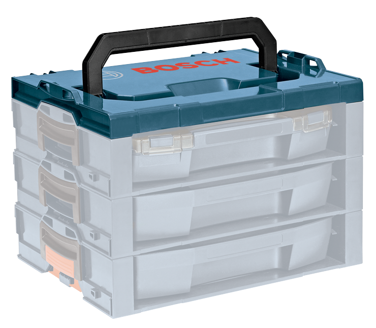 The Bosch L-RACK is a customizable expansion option for the Click and GO system. Users can now choose to add new L-RACK drawers, i-BOXX53 trays and organizer sets to expand their very own customized storage, organization and transport solution. Add a few l-racks to an L-Boxx (1, 1 A, 2, 3, 3D or 4) to build specific Tool Kit or stack them high or side-by-side to create a stationary storage system in your shop. The entire system uses the same single-click stacking technology, so you can keep organized and mobile. The l-rack-t is the top handle that attaches to the l-rack-s. This top handle provides easier portability to the stacked shelves. Combine the l-rack-t with multiple l-rack-s shelves to create a mobile organization structure to fit your needs.