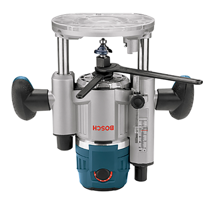 Bosch router with POWERFUL 15 AMP MOTOR producing 10,000 to 25,000 RPM and 2.3 HP, VARIABLE SPEED DIAL, FIXED BASE WITH THREADED HOLES, AFTERLOCK MICROFINE DEPTH ADJUSTMENT, SMOOTH PLUNGE ACTION, SPRING-LOCK PLUNGE LEVER, AND DEPTH ROD, and TRIGGER-CONTROL SYSTEM with lock-on button.
