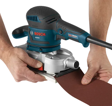 The Bosch OS50VC 1/2-Sheet Orbital Finishing Sander helps users to achieve perfect paper fit with the SheetLoc™ Supreme paper-clamping system. This increases the life of regular sandpaper. The tool comes with a high-performance extra-soft microcellular backing pad that conforms to many contours. Designed for kitchen installers, painters and cabinet makers, this sander features a Vibration Control suspension system that minimizes vibration for superior handling. The powerful 3.4 Amp motor allows for a high removal rate, while multiple soft-grip locations improve ergonomics and reduce hand fatigue. Two dust collection systems help keep your workspace clean, including a translucent microfilter dust canister with integrated paper filter, as well as a vacuum hose connection with airflow control. Match the speed and power to the workpiece and task for optimal performance with the variable-speed dial. The rugged die-cast aluminum gear housing eliminates wobble and vibration and extends the life of the tool.