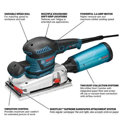 - Powerful 3.4 Amp motor - higher removal rate and maximum orbital sanding speed