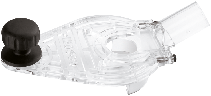 Transparent plastic tool with black knob and angled dust collection outlet.