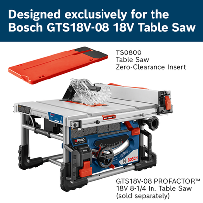 The Bosch TS0800 is a zero-clearance insert for the Bosch GTS18V-08 PROFACTOR™ 18V 8-1/4 In. Table Saw. This insert allows users to create the zero clearance, supporting the workpiece closer to blade. It offers improved control that minimizes tear out. It also reduces wood damage make precision cuts at 90 degrees, reducing the kerf clearance to the thickness of the blade.