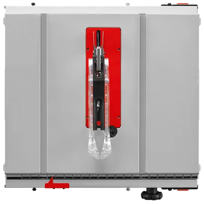 Table saw with gray and red accents; includes a clear plastic blade guard, and a ruler with black increments.